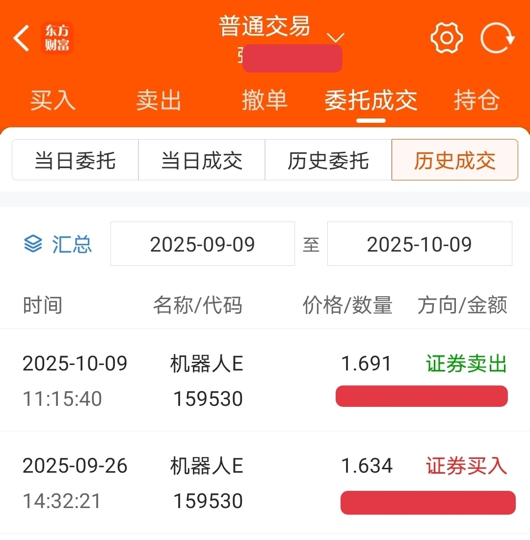 10月9日,国庆假期结束后的第一个交易日开盘前我仍有幻想,如果开盘向上突破,就说明市场还看好后市政策面基本面有更多的利好催化,然而,机器人E的股价开盘就小幅跳水,我没有着急,因为下面位置是5日和10日线,会有短线反弹,然后果然11点多的时候翻红了,我没有丝毫犹豫,果断地点击了卖出按钮。那一刻,我的手有些微微颤抖,但内心却是坚定的。我知道,我做出了正确的选择。