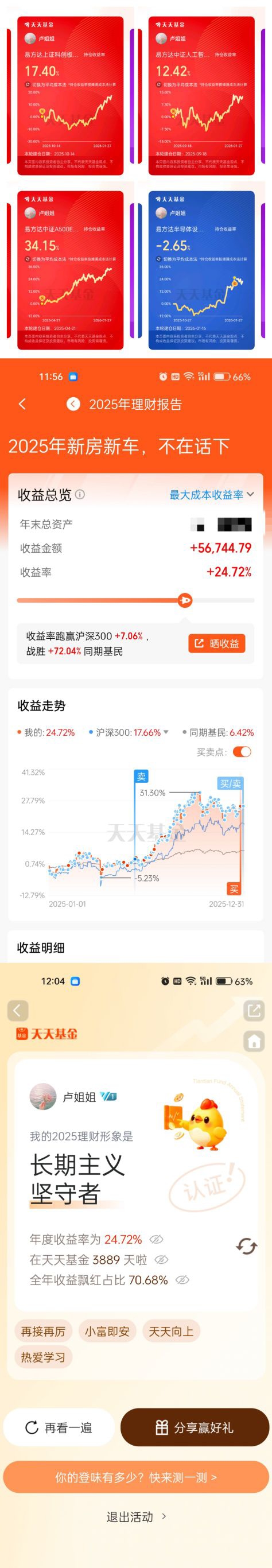 回看2025年,上证指数从年初3262点涨至3968点,终于春暖花开,我所持有的易方达中证A500ETF联接C(022460),定投买入,收益回报率34.15%;所持有的$易方达上证科创板芯片ETF联接C$,收益回报率17.40%;所持有的持有的易方达中证人工智能收益率12.42%,持有体验感很好,还持有易方达半导体设备,红利基金等。经过10多年买入基金的经历,会发现一遇市场大跌,心态更好了。看来躬身入局,知行合一,而且一定程度上可以让你超越运气的存在。