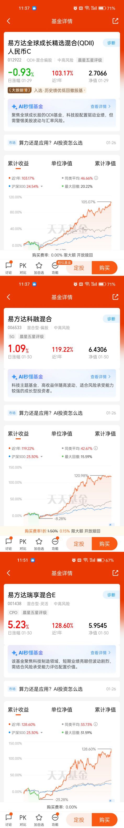 “时来天地皆同力”。近年来,国内基金产品正迎来极好的时代,也是蓬勃发展的黄金时代,我要学习价值投资先锋巴菲特,坚持价值投资易方达上证科创板芯片ETF联接C、易方达科融混合、易方达中证人工智能等等,未达到目标赢利点坚持定投买入,要有“千磨万击还坚劲,任尔东西南北风”勇气,通过布局这些基金,更好地把握结构性机会。@易方达基金