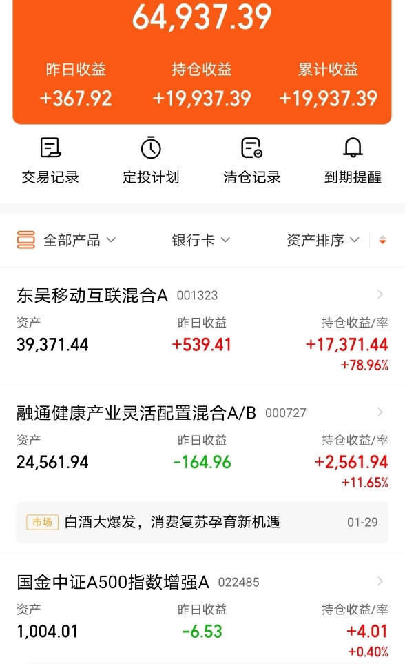现基金资产64937.39元,盈利19937.39元。其中,融通健康产业收益率为11.65%、东吴移动互联混合A收益率为78.96%、国金中证A500指数增强A收益率为0.40%。
