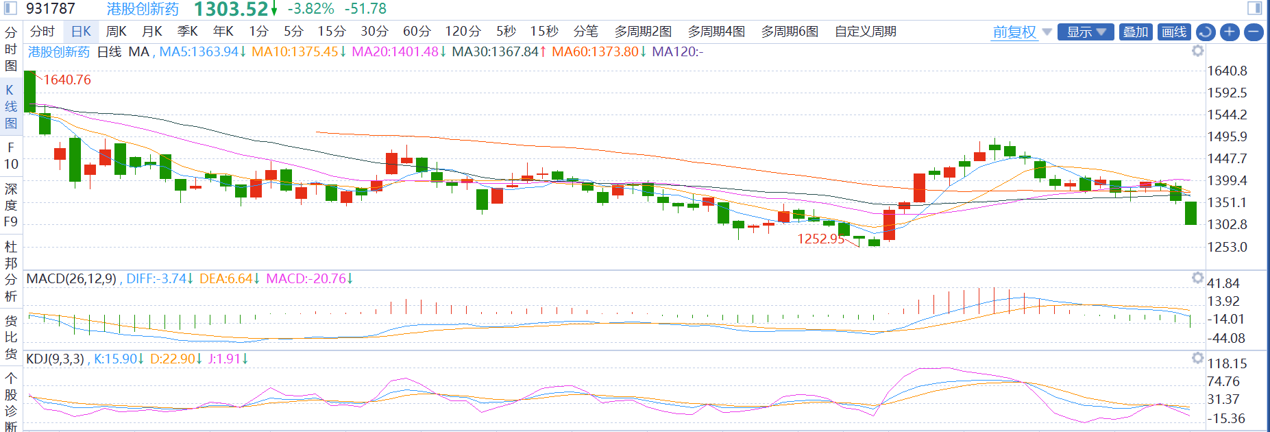 港股创新药(931787):早盘跌幅3.84%,创近期新低。大阴线贯穿所有均线,属于典型的破位下杀。MACD绿柱斜率向下,看不到止跌迹象。