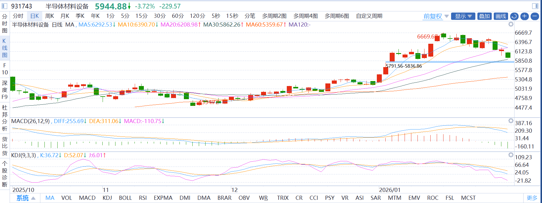 半导体材料设备(931743):今日早盘大跌3.61%,直接砸到了MA20(6207点)支撑位。MACD绿柱冒头,J值降至-9.99。前期获利盘出逃非常决绝,属于被“错杀”的重灾区。