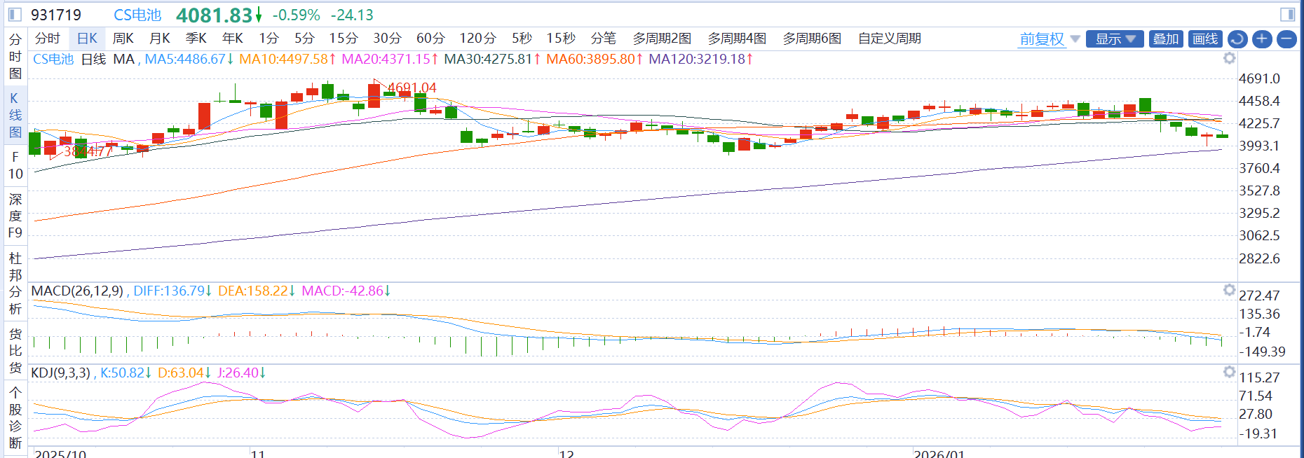 CS电池(931719):早盘板块指数跌0.65%,回踩近期低点平台。MACD绿柱还在,但J值已经来到6.73,属于超卖,目前整体情绪不好,持仓不动,继续观望!