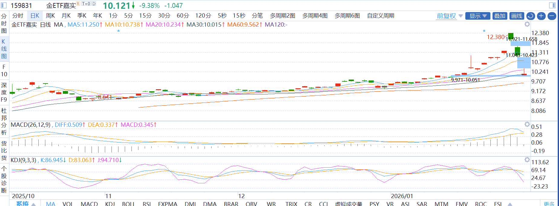 黄金板块(上海金ETF 159831):惨!上海金ETF今天跳空大跌8.85%,一举抹掉了今年绝大部分涨幅。均线多头形态被瞬间摧毁,MACD红柱转绿。J值跌回12.49,这种单边崩盘式下杀说明前期投机泡沫正在被暴力戳破。