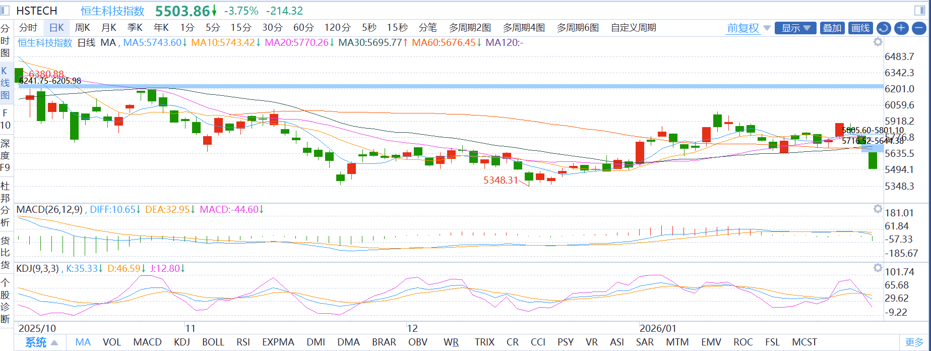 恒生科技(HSTECH):恒科今日跌3.68%,一根大阴线直接砸穿了MA5、10、20三根短期均线。MACD绿柱快速放大,KDJ死叉向下,J值杀到12.91的冰点区。短线空头情绪宣泄得非常猛烈。