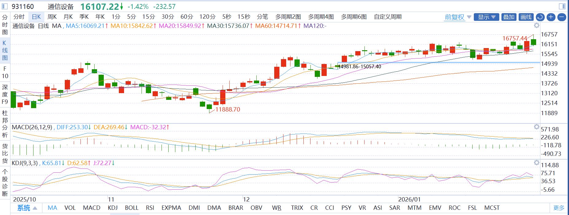 CPO/通信设备(931160):早盘跌1.62%,回踩MA5。MACD还在红柱区间,均线依然维持多头排列。这属于上周连续上涨后的技术性修正,正常。
