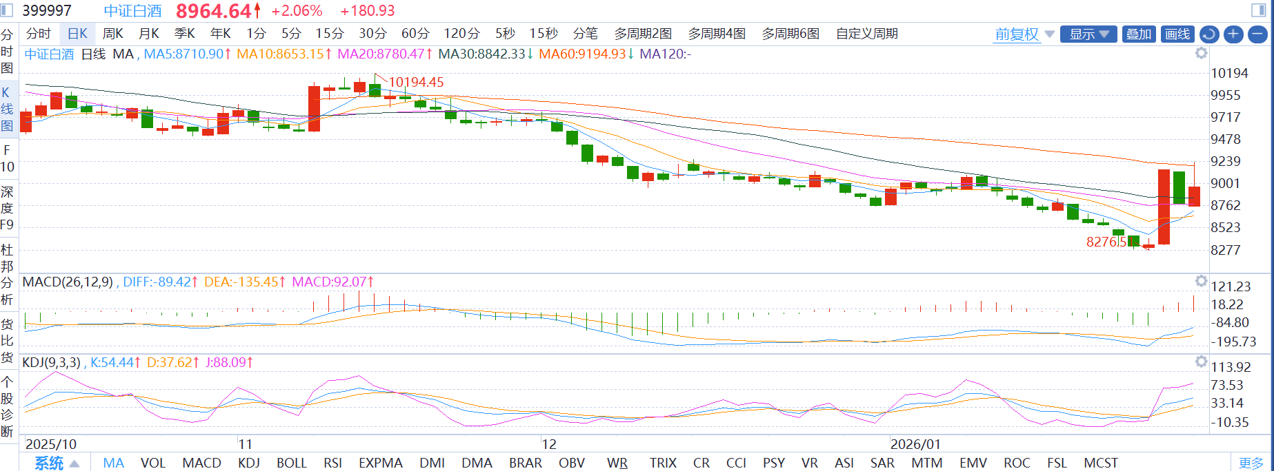 中证白酒(399997):今天居然成了“定海神针”!白酒逆势涨2.36%,一阳穿二线(MA5/10)。J值反弹到90.25,MACD红柱也在加长。作为超跌板块,在资源股崩盘时,资金明显在往这个低位避风港钻。麦爸节前消费预期还在,白酒可以作为账户的防御性配置,但麦爸觉得白酒还是得继续观望,不动,想动还不如去新消费、零售板块!