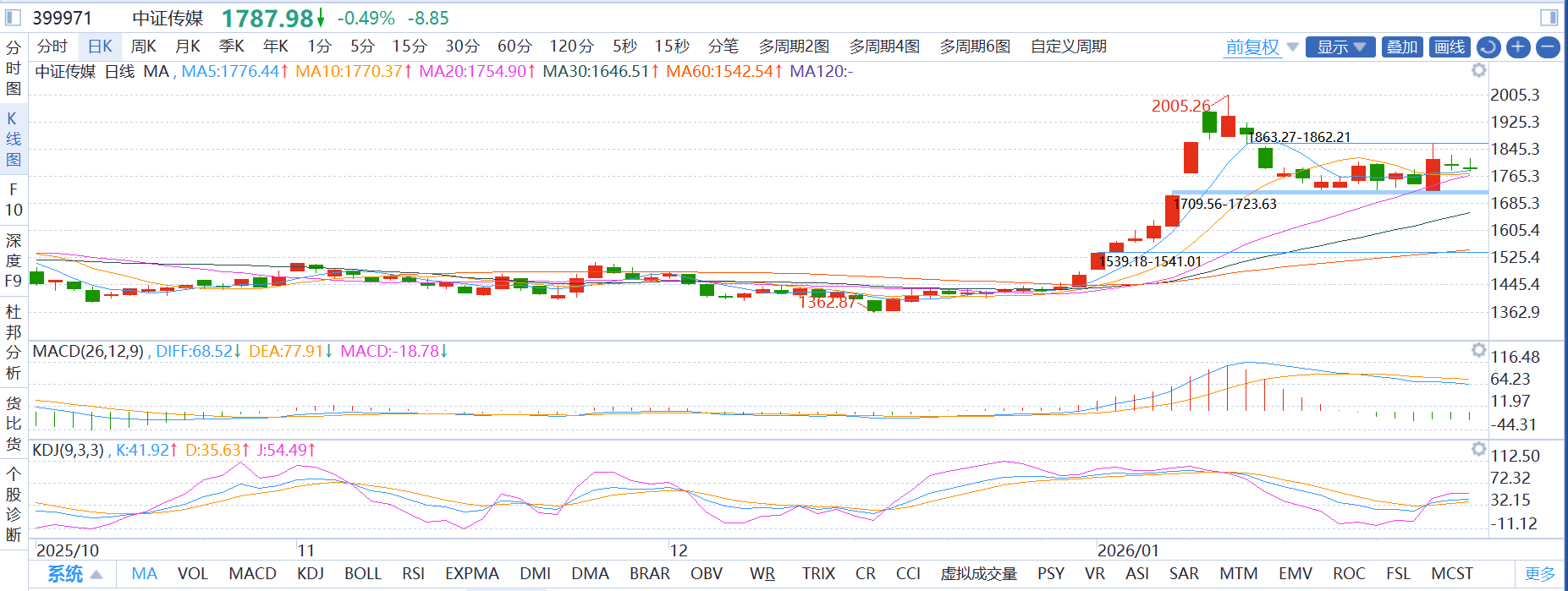 传媒/AI应用(399971):今日板块技术面极强!传媒应用板块在普跌中顽强翻红涨0.46%,稳稳站在MA5上方。MACD红柱虽缩短但多头趋势未改,J值63.44处于健康区间。
