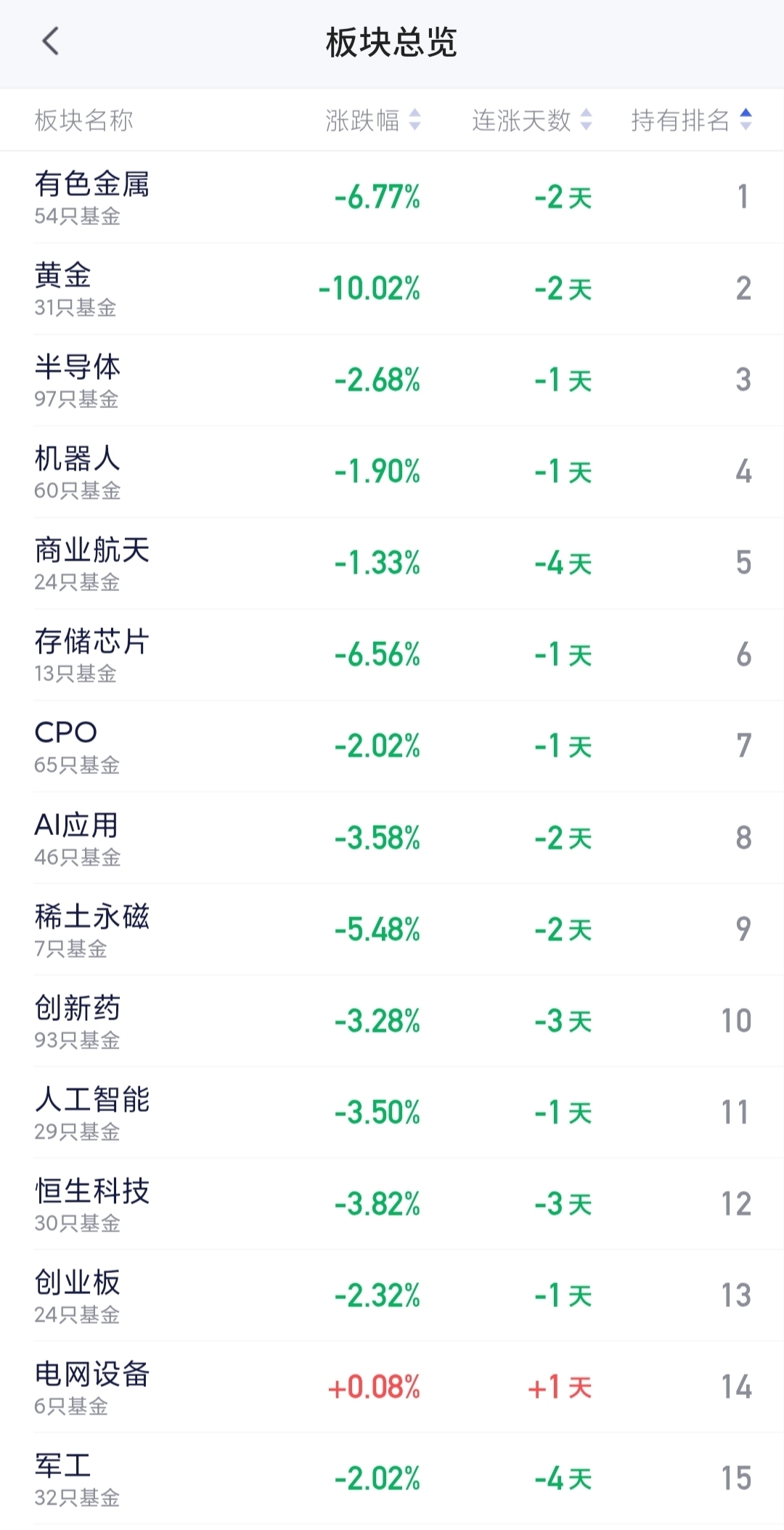 1. 有色金属(-6.77%,连跌2天,持有排名第1)
