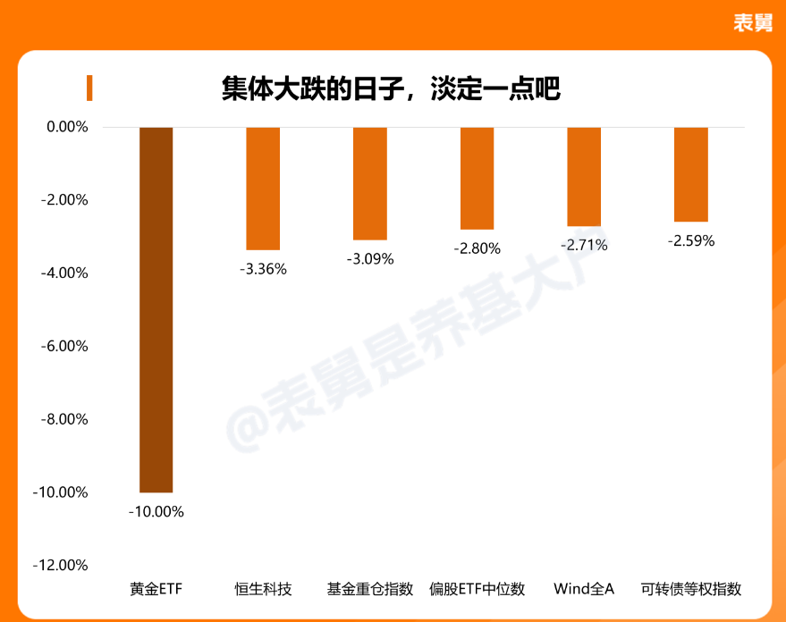 再看一张,下图,今天恒科跌-3.4%,wind全A跌-2.7%,1100只股票型ETF的跌幅中位数是-2.8%,转债等权指数跌-2.6%,公募基金重仓指数跌-3.1%,黄金ETF跌停,因此,按摩一下: