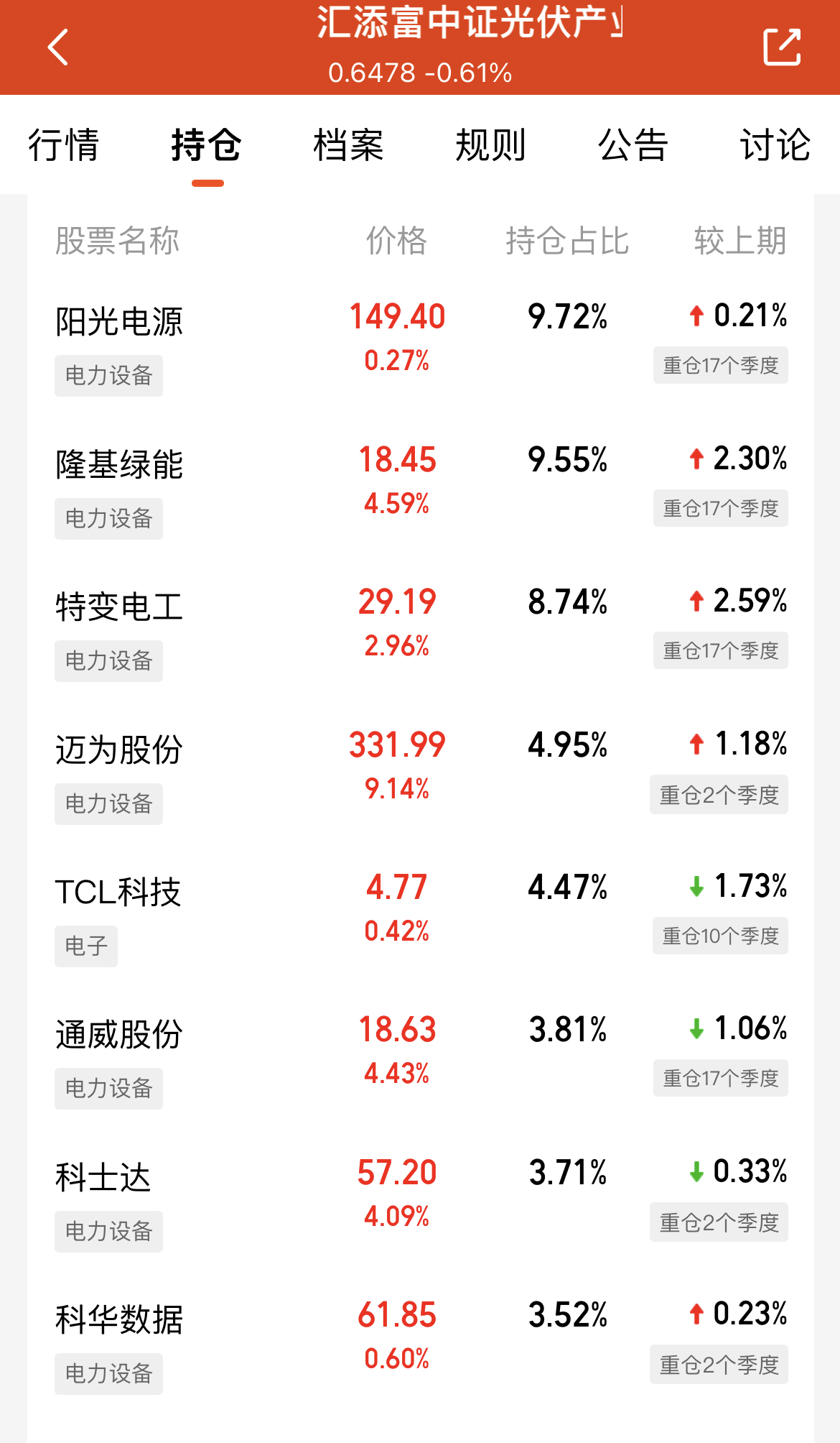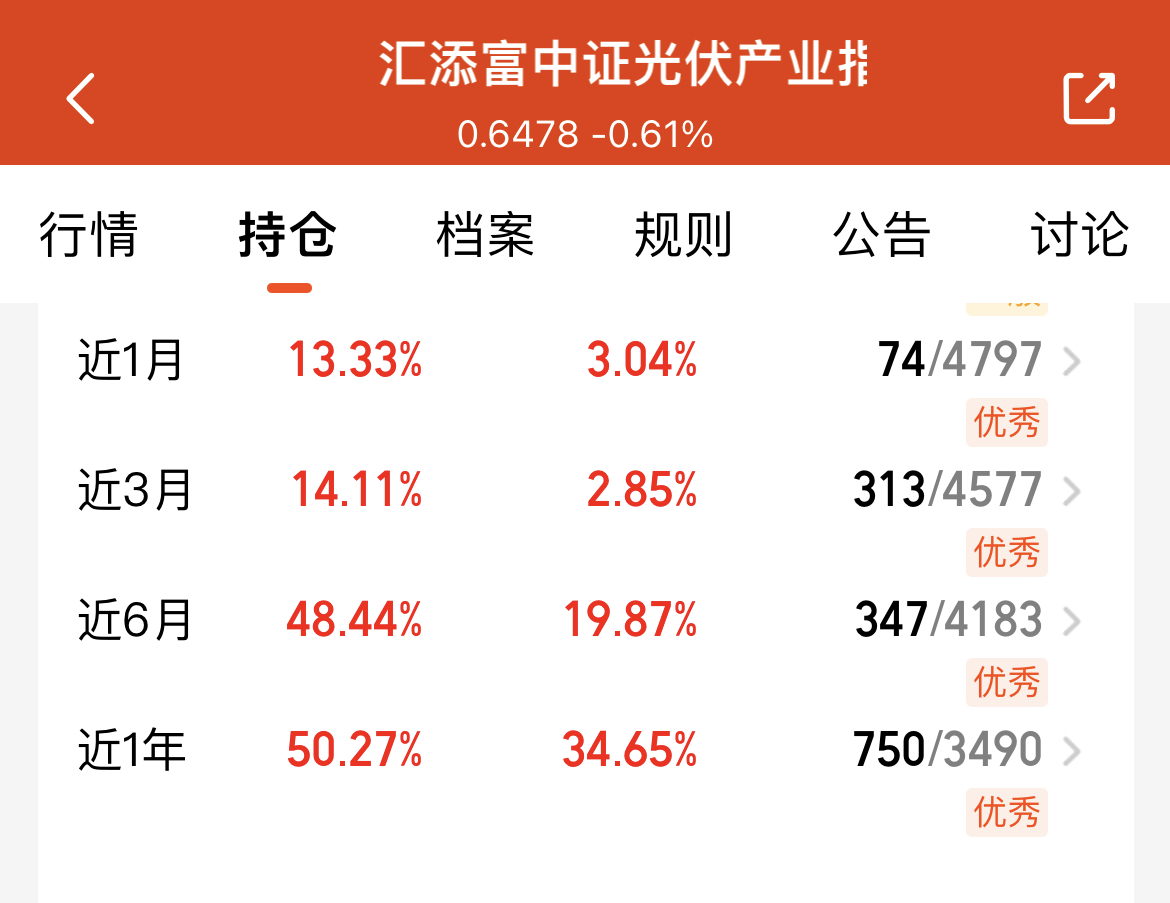 今天市场回暖,不少板块开始修复,光伏板块盘中涨幅超2.5%,我打算加仓$汇添富中证光伏产业指数增强发起式C(OTCFUND|013817)$这只基金精准跟踪光伏产业指数,同时通过增强策略获取超额收益,近一年涨幅50.27%,大幅跑赢同类平均水平,业绩表现优秀。它重仓隆基绿能、特变电工等龙头企业,覆盖光伏全产业链,最新还新增了阿特斯、东方日升等标的,布局更贴合行业趋势。