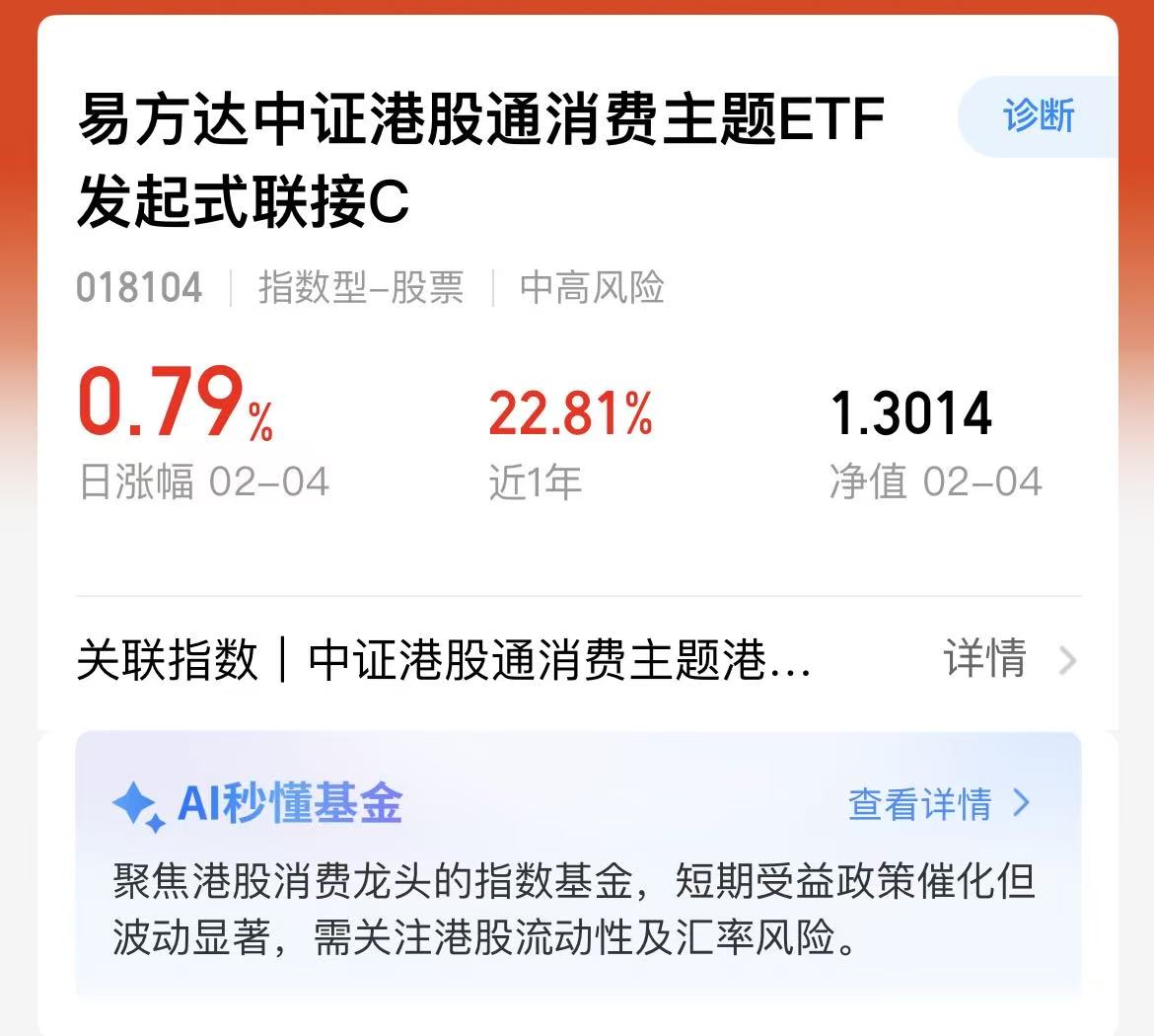 今日港股大盘走弱,港股消费板块却逆势领涨,中证港股通消费指数涨2.0%,百胜中国、泡泡玛特等成分股大幅走高,叠加9天超长春节假期临近,酒旅、餐饮、黄金零售等消费需求来咯。$易方达中证港股通消费主题ETF发起式联接C(OTCFUND|018104)$跟踪中证港股通消费指数第一大权重泡泡玛特占比12%,为港股消费类基金最高,重仓覆盖传统酒旅餐饮龙头,也囊括潮玩、金饰等,我继续看好未来前景。$鹏华中证港股通消费ETF联接C(OTCFUND|016953)$ #段永平提前加仓!茅台股价重回1500元# #马斯克密访中国光伏链?上市公司密集回应#