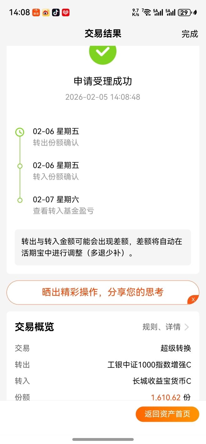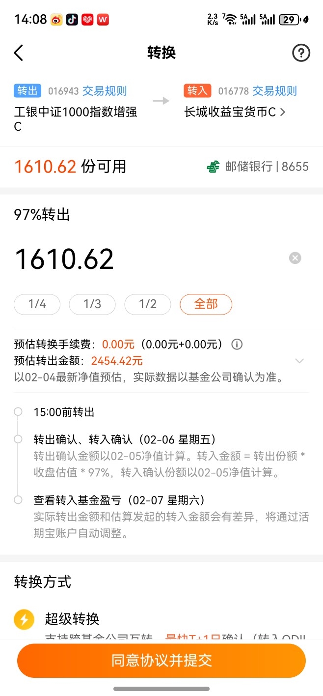 在今天,已经选择清仓减掉卖掉某个增强型中证1000指数基金跑了。
