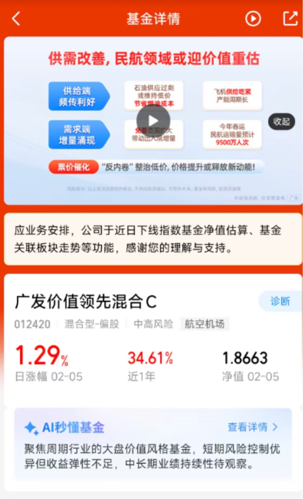 #暖阳创作计划# 大盘休整,它却成了最靓的仔!广发价值领先C这波走势,简直是对坚守者最好的回报。近期净值连创新高,表现亮眼到不行!为啥这么强?经理对民航的执着深耕,终于等来了行业质变时刻:航司集体扭亏为盈,春运需求炸裂。当回家的机票又贵又难抢,真实的数据就在为净值上涨投票。在躁动的市场里,这种基于深度研究的定力,带来的回报格外踏实和舒心!$广发价值领先混合C$
