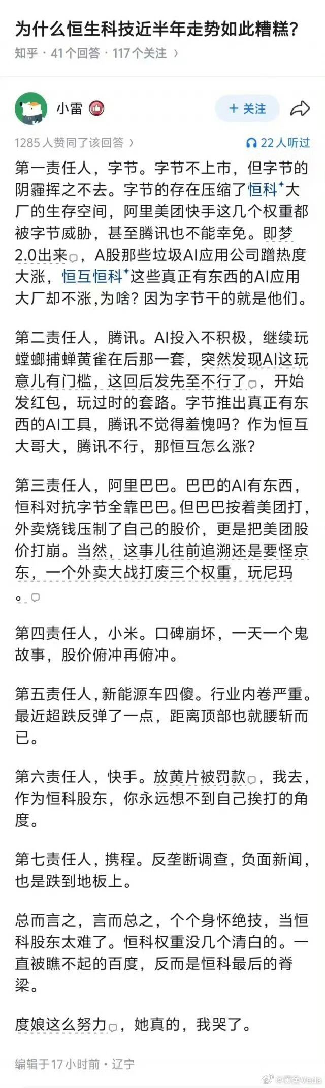 字节叙事出来了,大意就是,字节干崩恒科中的互联网公司,字节发展越好,恒科就越差。