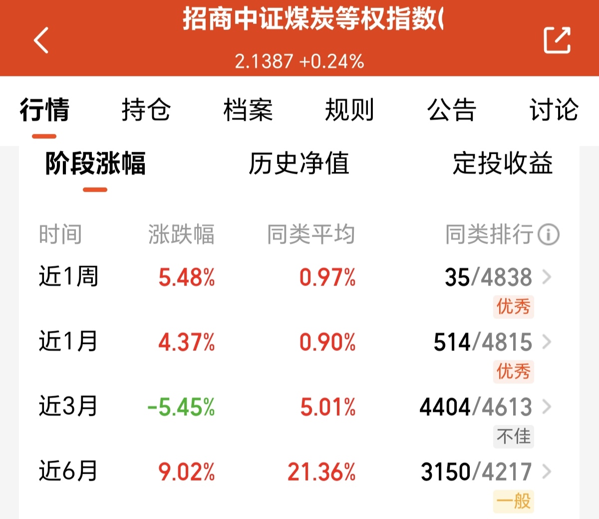 今日两市成交缩量,个股呈现涨跌互现,但煤炭赛道却能再次走强,从趋势面来看,当前正进入需求旺季,主力资金也是净流入明显,后市前景可期,其中$招商中证煤炭等权指数(LOF)C(OTCFUND|013596)$目前估值大涨1.4%,因具有等权优势,同时提升小票占比,所以进攻能力更是十足,我也将持续看好啦!