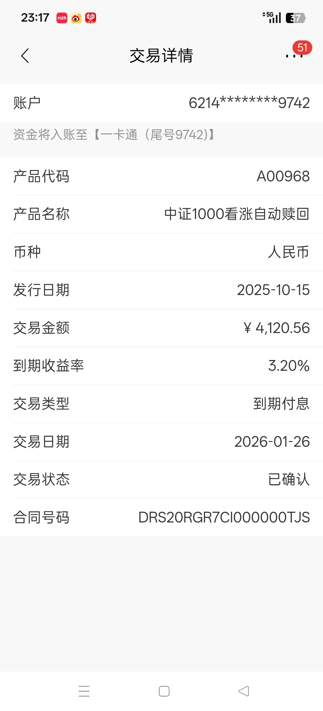#暖冬创作计划# 最近买的结构性存款,中证看涨1000自动赎回,已经敲出,利息3.2%.10.23号起息,1月26号敲出,历经3个月,利息是4120.56.跑赢现在市面大部分稳健理财,继续努力。我是很喜欢这种稳健理财,目标一年最少4%个点收益,以现在的资产完全可以躺平