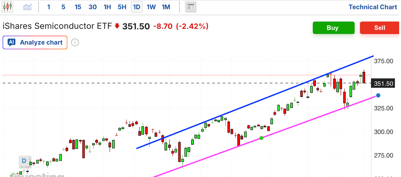 费城半导体指数 (SOX) / SOXX ETF:指数正处于高位向下“俯冲”阶段。在经历长期的非理性繁荣后,近期出现的实体大阴线具有极强的转势信号。目前指数正在回踩支撑趋势线,若此处破位,下方将直接考验去年底的震荡平台。高点逐级下移,显示该板块重心已实质性下沉。