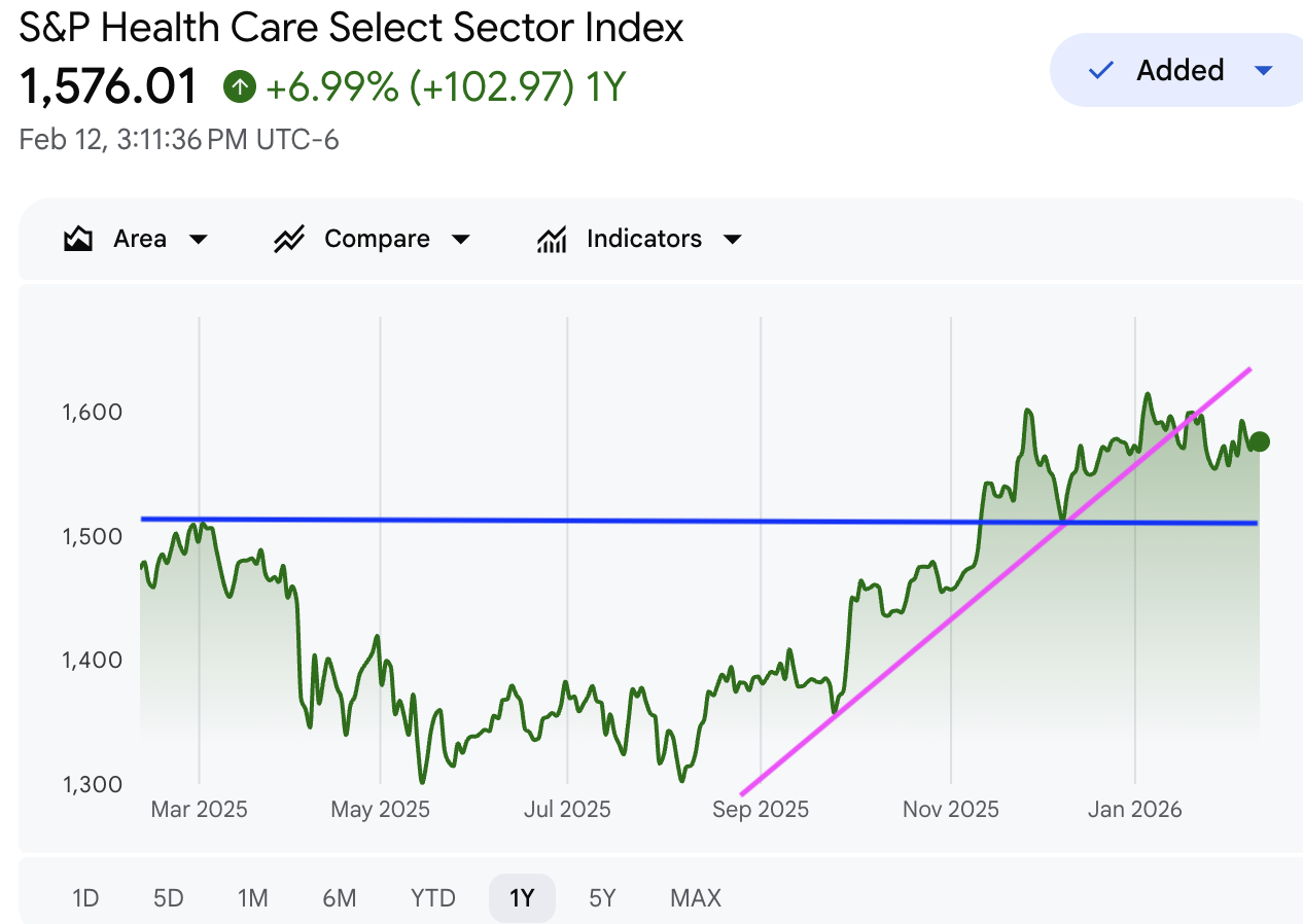 标普健康医疗指数 (Health Care):在全球市场全线覆没之际,医疗板块凭借其极强的防御属性和反周期特性,成为避险资金最后的避风港。图形显示该板块高位企稳,重心稳固,每当大盘走弱,便有资金进场托盘,展现出优秀的避险溢价。