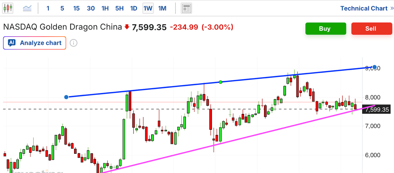 纳斯达克中国金龙指数 (HXC):中概股重心持续下移,目前正经历弱势震荡回撤。周四的跌幅抹杀了此前的反弹努力,尽管当前区域历史上多次触发技术性反弹,但目前在平行下降通道内运行的“阴跌”特征明显,多头“最后阵地”面临严峻考验。