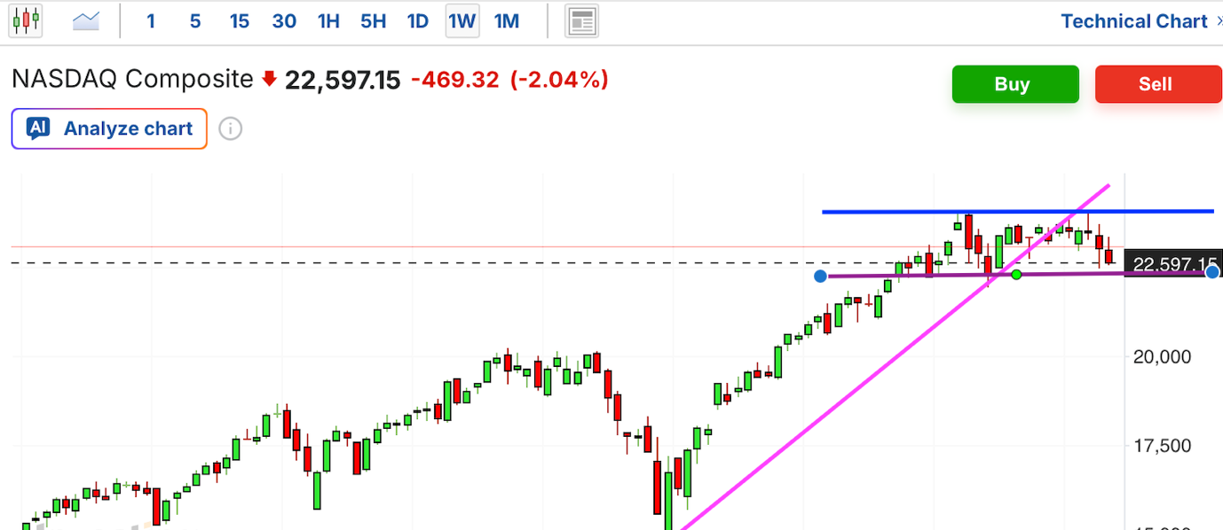 纳斯达克综合指数(NASDAQ ):目前纳指正处于高位剧烈震荡后的向下变盘窗口。周二的放量重挫直接击穿了短期支撑,显示出极强的抛压动能。技术面上,指数已触及长期上升趋势线的生死边缘,高位局部的“圆弧顶”雏形初现。若短期内无法在关键支撑位企稳,市场恐将陷入更大规模的技术性止损盘回吐。