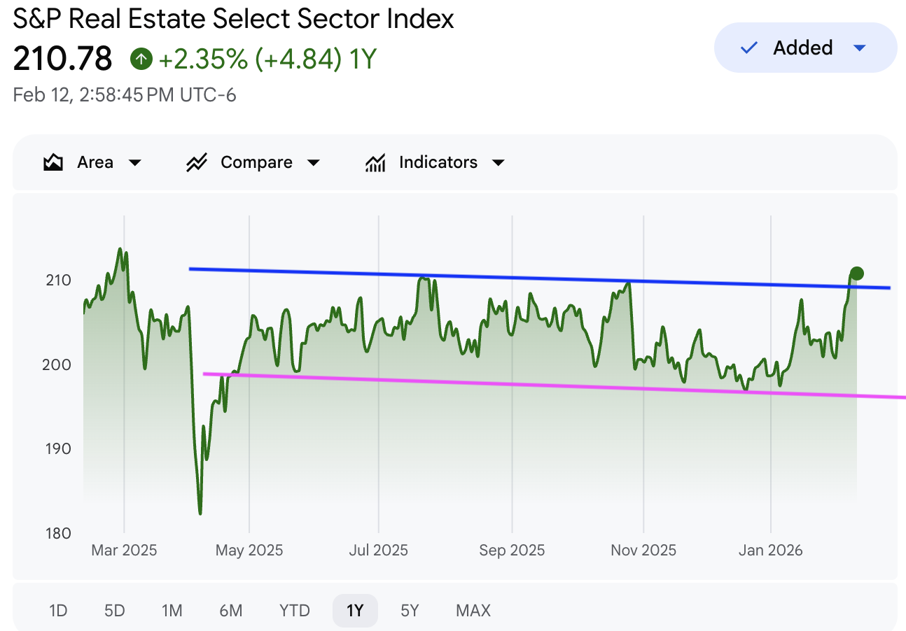 标普房地产指数 (Real Estate):房地产指数在经历长期的底部震荡后,近期试图开启反转行情。虽然目前回落至“生命线”位置,但只要能守住该支撑,则中线上行通道依然有效。目前正处于突破后的二次确认阶段,关键看后续买盘动能能否持续释放。