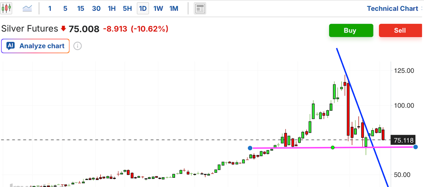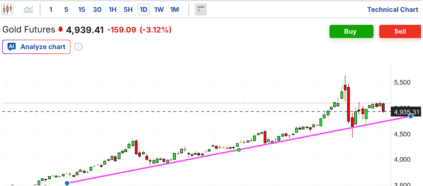 黄金 (Gold Futures):作为避险之王的黄金,今日表现令人心惊。单日跌幅超 3%,直接跌穿 5,000 美元心理防线。这种放量大跌并非基本面恶化,而是典型的“流动性挤压”——在全资产暴跌背景下,机构被迫抛售黄金以回笼资金头寸,市场正经历去杠杆引发的强制平仓潮。