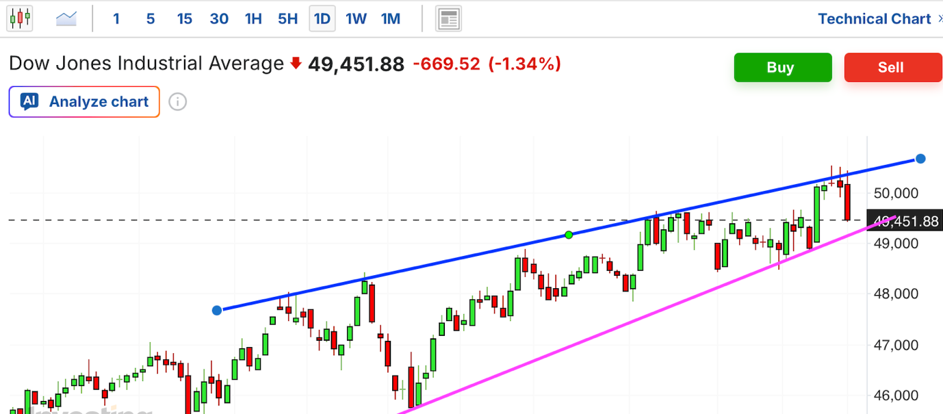 道琼斯工业平均指数:下跌 669 点(-1.3%),在连续四天坚守后,最终失守 50,000 点大关。