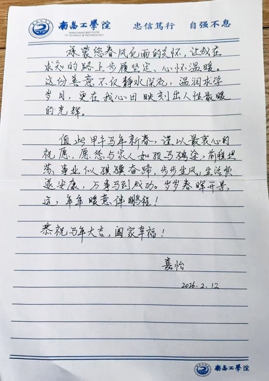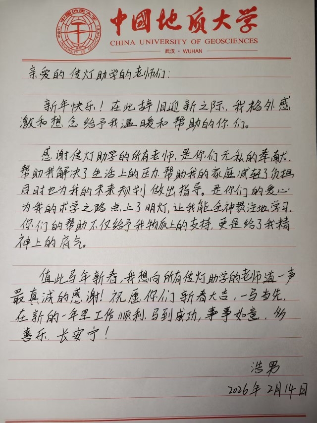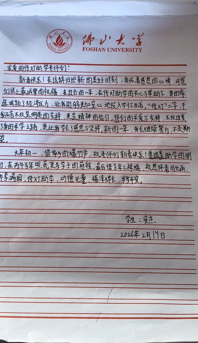 新春快乐!在这辞旧迎新的美好时刻,我怀着感恩的心情,向您们送上最诚挚的祝福,在过去的一年,在传灯助学的关心与帮助下,我的家庭减轻了经济压力,让我能够更加安心地投入学习与生活。“传灯”二字,于我而言不仅是物质的支持,更是精神的指引,你们的关爱与支持,不仅改变了我的求学之路,更让我学会了感恩与坚持。新的一年,我会继续努力,不负期望。