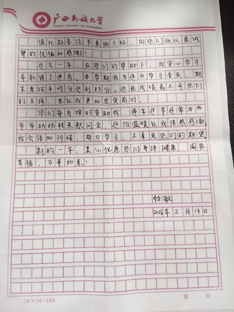 您们每月按时资助我,逢年过节还常为爷爷奶奶转来慰问金,这份温暖让我倍感感激。我会倍加珍惜,努力学习,不辜负您们的期望。