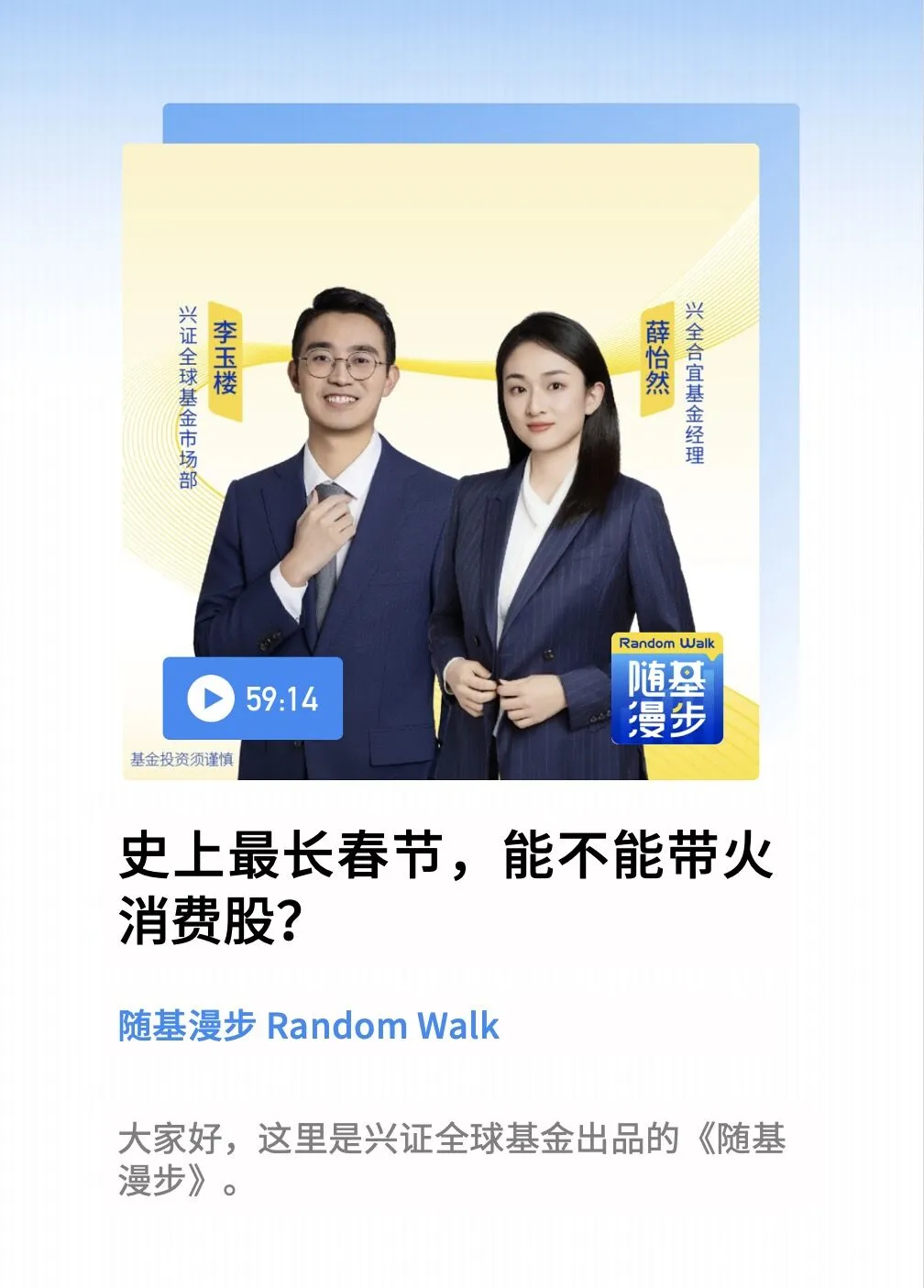 本期节目发布时,各位读者或许已经踏上回乡、出游的旅途,旅行、餐饮、购物,这些常见的节庆场景里,暗藏着哪些行业变化的草蛇灰线?本期随基漫步,我们请到了兴证全球基金基金经理薛怡然,与您一道前瞻春节消费市场。