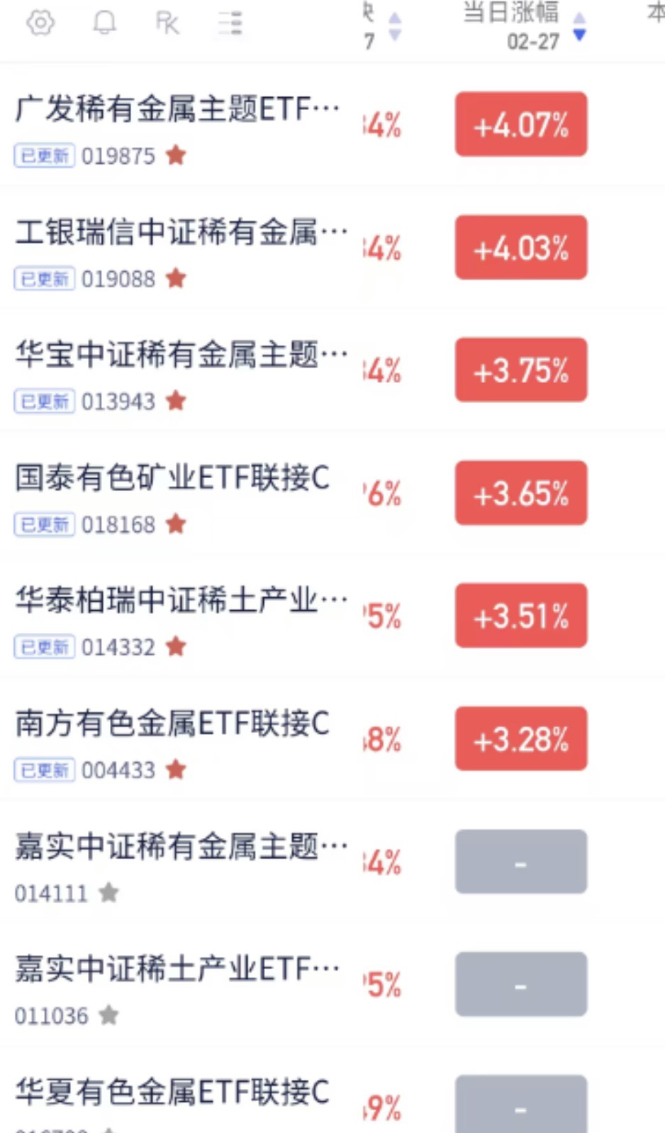 #稀土小金属走强 战略资源价值重估持续# 刚才复盘了一下,有色金属分支里,小金属的进攻性确实最强。广发稀有金属ETF联接C最近这四天连拉带涨,今天整体身位又抬高了4.07%。对于这个产品,我的建议是别轻易下车,目前属于利好叠加期。我会继续拿着,看看这一波能不能突破去年的高点,反正C类拿着也不心疼手续费。