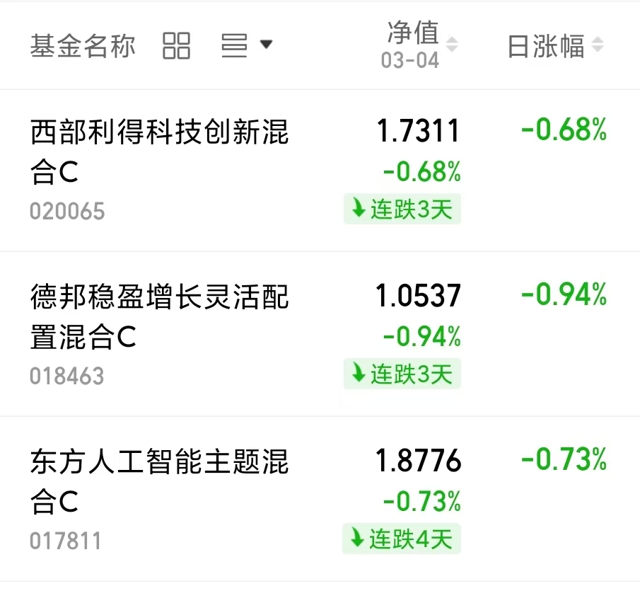 今天市场行情赛道轮动,但是我感觉行情差不多该企稳了,对科技、ai应用还是有信心,我看$西部利得科技创新混合C(OTCFUND|020065)$今天-0.68%比德邦还强点,感觉应该是底了吧~