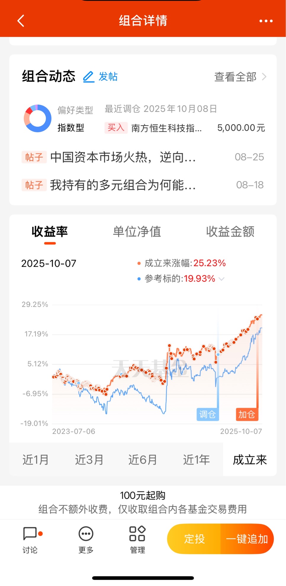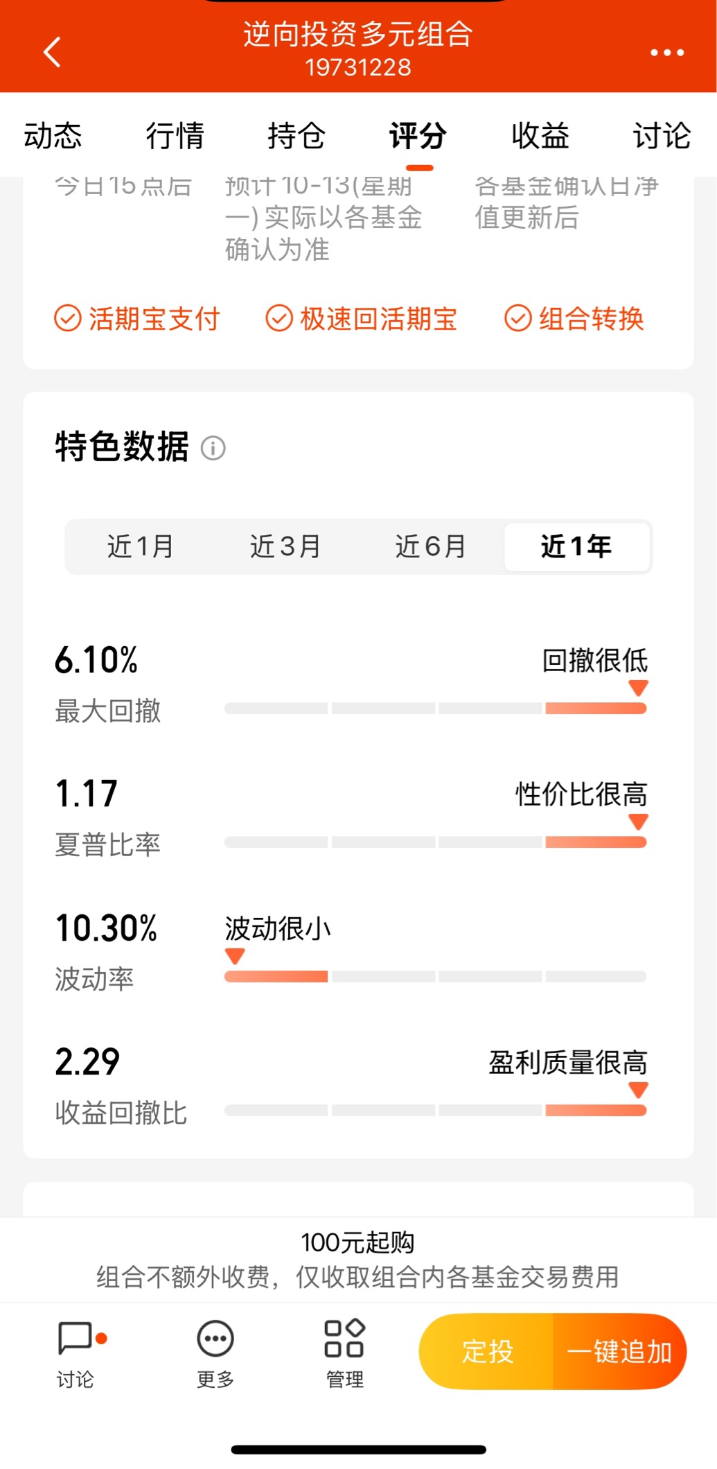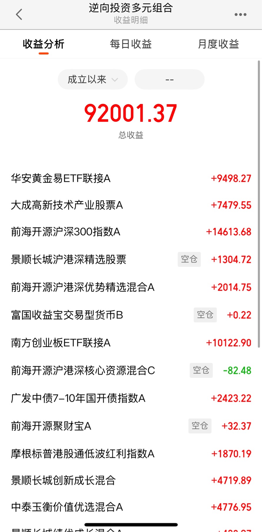 我们的组合【逆向投资多元组合】成立以来收益超9万元、成立以来坚持逆向投资,也就是针对性权益资产,涨了就少买,跌了就多买,另外底仓配置黄金仓位,在国庆节黄金周期间迎来大涨,我们也会受益。另外除了配置国内权益债券以外,也积极参与海外权益,以及海外债券。