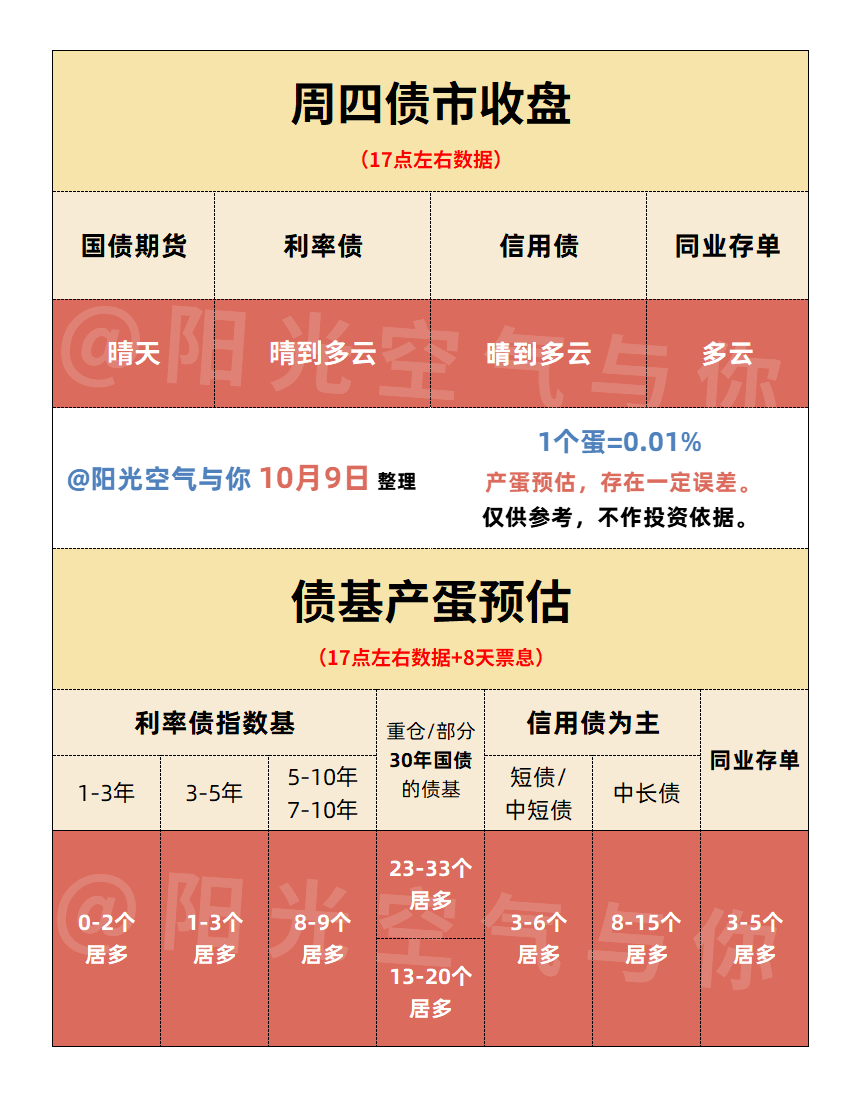 重仓30年期国债的基金预估产蛋23-33个居多,7-10年利率债指数基金预估8-9个居多,其次,比较多的是信用债为主的中长债基金预估产蛋8-15个居多。另外,就是1-3年、3-5年利率债指数基金预估较少,因为盘面局部还是绿的,所以综合预估较少。