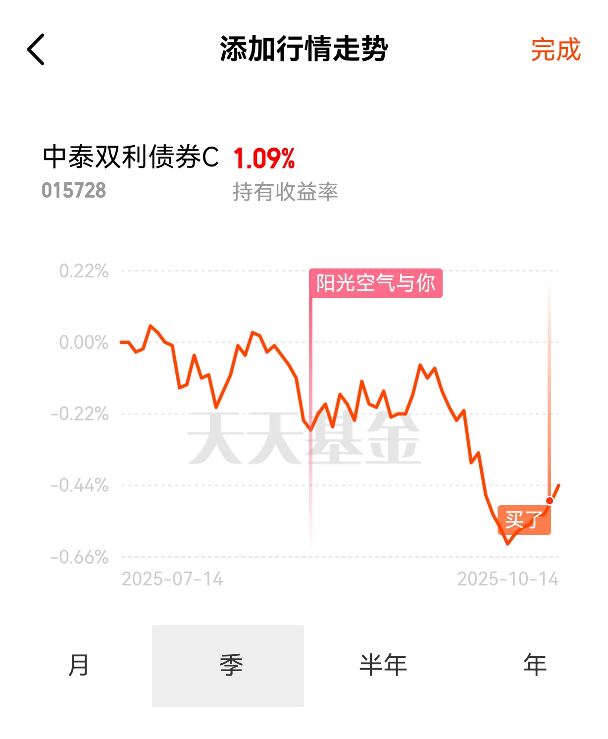 (1)今天阳光个人加仓中泰双利债券C,在2024年和2023年分别实现了6.22%和3.14%的涨幅,均跑赢同类平均水平;同时,他的回撤控制很好,近1年最大回撤仅0.75%,是一只长期稳健增长的低波固收+基金。中泰双利主要持仓中高等级信用债,以获取稳定的票息收益;其约8%的股票里面主要配置了银行股等。这也使得基金近3个月的表现相对较弱。不过,随着近期银行板块在高位回调后出现明显的修复迹象,中泰双利也在过去7个交易日中实现了6天上涨、1天持平。其实周一阳光已经误打误撞加了一次仓,尽管在15点前注意到了,不过本来就打算近期配置,所以没有撤销操作。今天个人继续加一些。