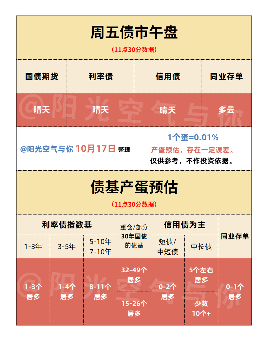 午盘产蛋预估:重仓30年国债的基金预计产蛋32-49个居多,其他的纯债大概率产蛋,混债基金少数有望产蛋。