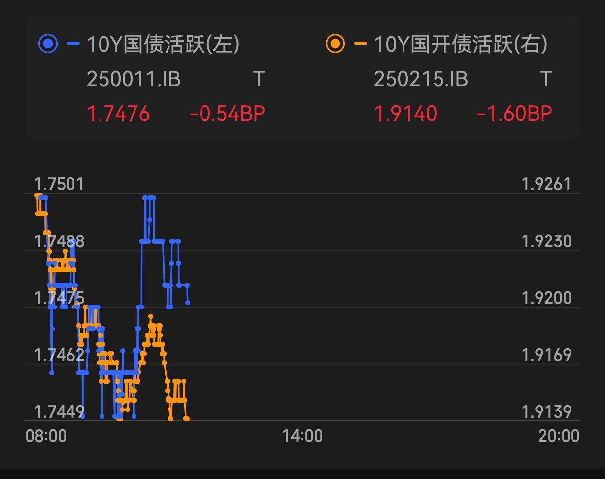 好消息,今天债市还是很不错滴!特别是10年期国开债活跃券收益率已经下行1.5BP多了。
