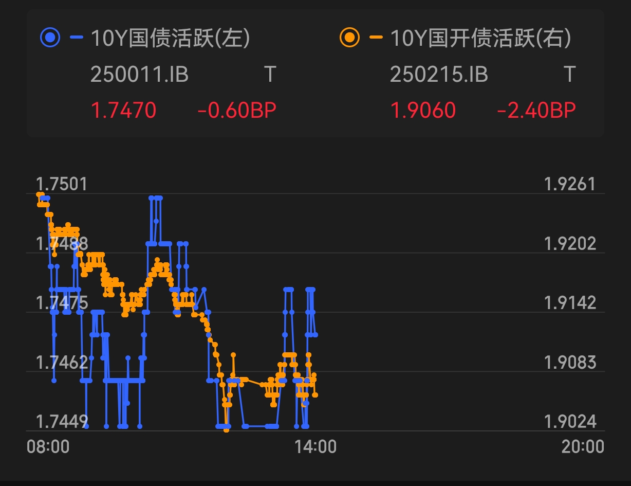 午后A股延续走弱,债市强势拉升,10年期国开债活跃券收益率已经下行超2BP了。