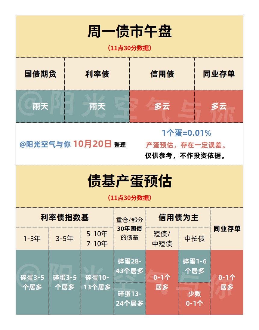 午盘产蛋预估:混债基金应该大部分有蛋。信用债为主的短债/中短债基金有望产蛋,利率债基金普遍碎蛋。