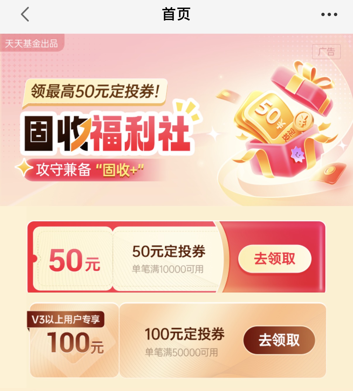 即可领取50元定投券,V3以上用户更可专享100元定投券。数量有限,先到先得。