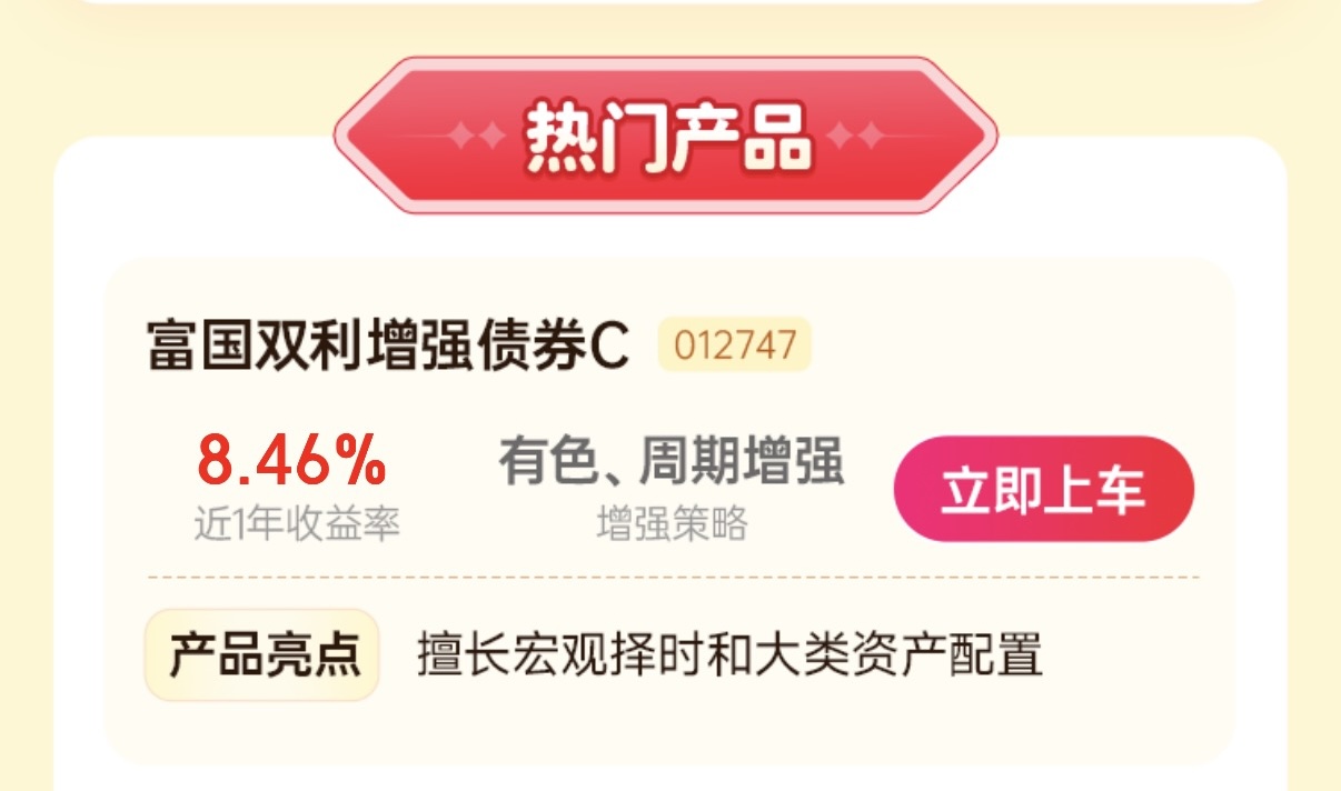$富国双利增强债券C(OTCFUND|012747)$、$富国双利增强债券A(OTCFUND|012746)$、$富国优化增强债券E(OTCFUND|018980)$、$富国久利稳健配置混合E(OTCFUND|019370)$、$富国全球债券(QDII)人民币C(OTCFUND|019518)$、$富国亚洲收益债券(QDII)人民币C(OTCFUND|019709)$、$富国双利增强债券E(OTCFUND|024731)$、$富国中债7-10年政策性金融债ETF发起式联接E(OTCFUND|019596)$、$富国裕利债券E(OTCFUND|018187)$、$富国优化增强债券A/B(OTCFUND|100035)$。#好基已就位#、#10月基金投资策略#、#选基攻略#、#高盛看多A股:慢牛正形成 还有约30%上涨空间#、#15连阳!农行总市值逼近2.9万亿#、#黄金创12年来最大单日跌幅!什么信号#