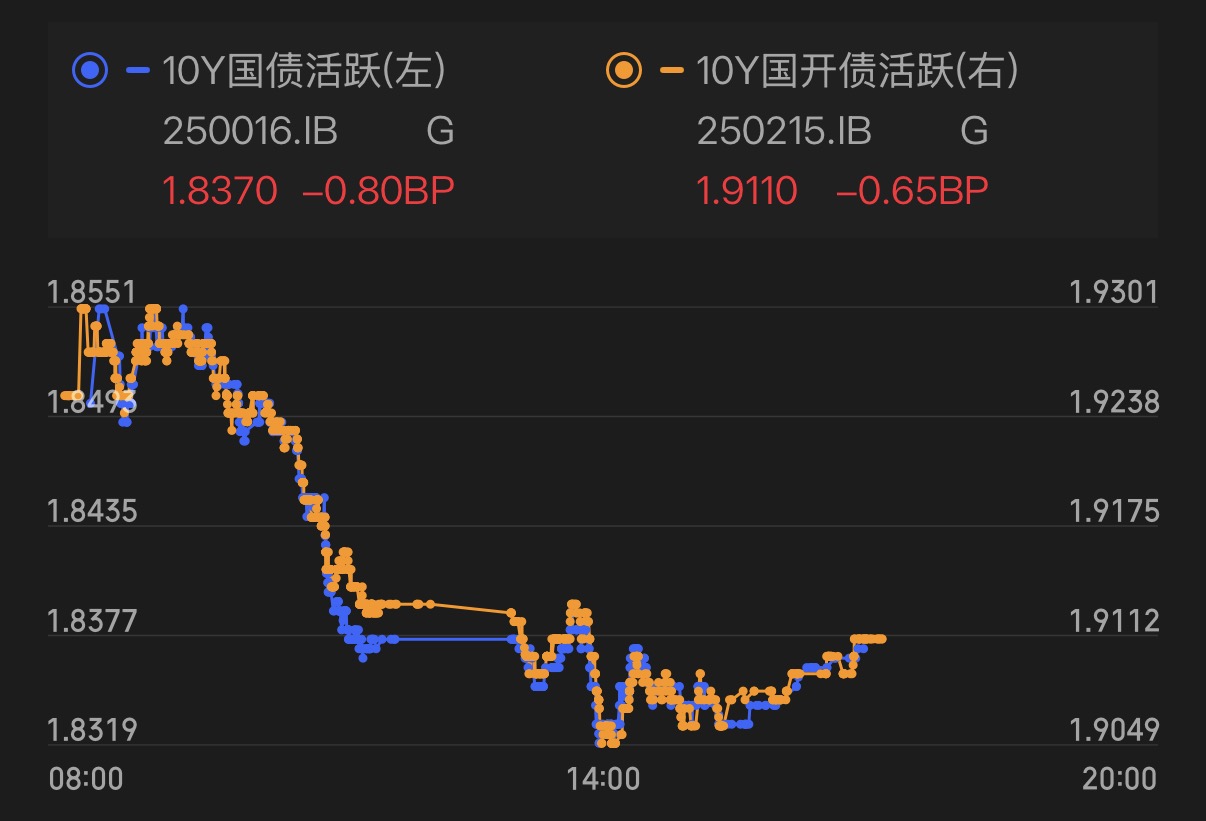令人惊喜的是差不多在17点十几分的时候,10年期国债活跃券收益率突然大幅下行3BP左右。