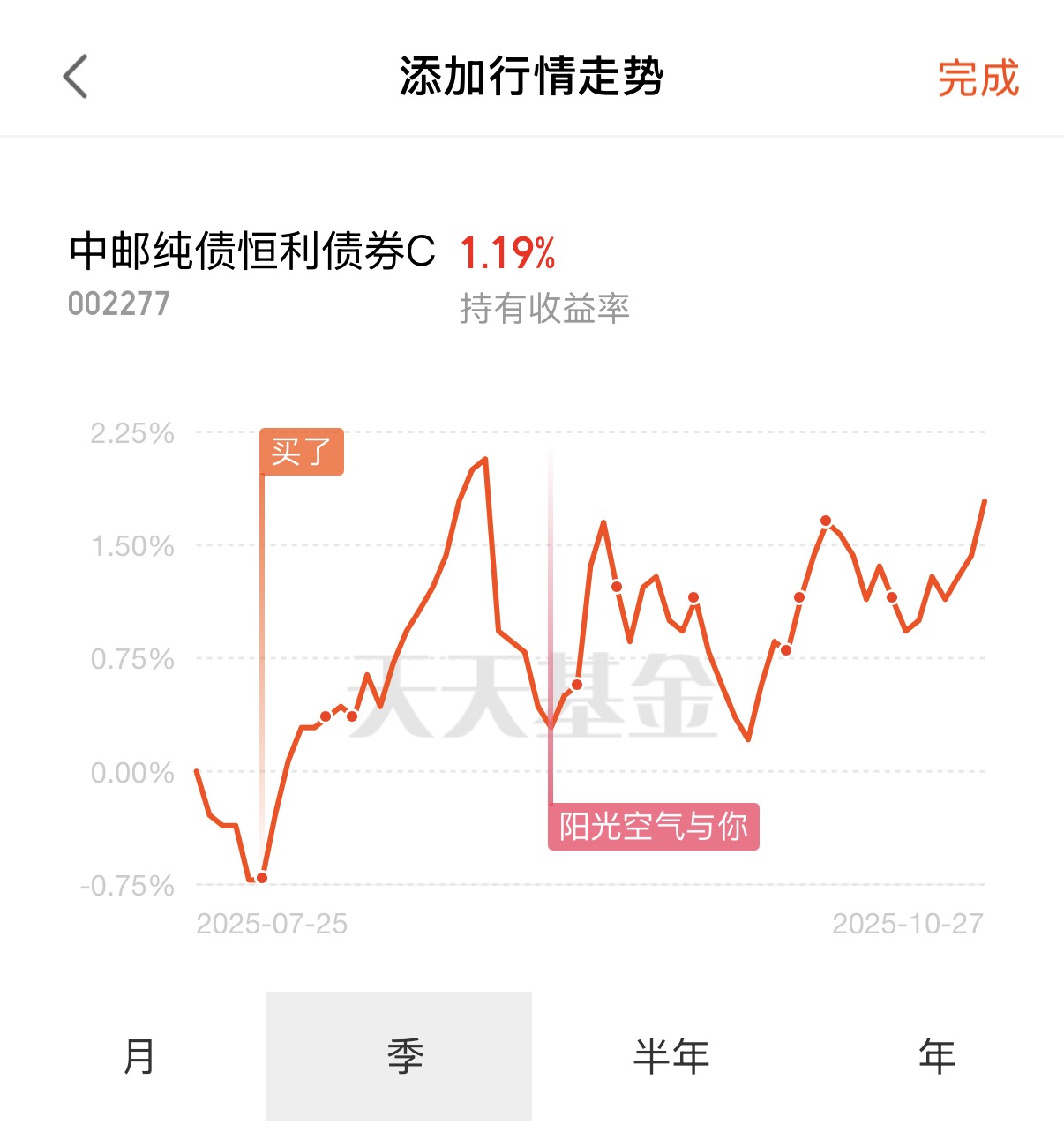 (1)今天阳光个人继续加仓中邮纯债恒利债券C,近1年涨幅11%,大幅跑赢同类平均的4.41%,昨天爆蛋35个,属于经常有惊喜的固收+基金。根据三季报,基金维持偏低纯债仓位,久期调至中性,转债仓位有所下调,整体配置更趋均衡稳健。中邮纯债恒利的管理费处于同类最低一档,持有成本更具优势。现在各阶段业绩均是同类优秀水平,个人持有收益率也有1.19%了(分批入场的),持有体验还是很不错滴!值得一提的是,中邮纯债恒利与昨天个人加仓的中邮睿信是同一位基金经理管理,属同策略下的不同波动版本,中邮纯债恒利更稳健,他们的业绩都不错,基金经理投研能力还是很强的,看好这2只的后续表现。今天趁着债市强势修复、可转债趋势也不错,个人再加一些中邮纯债恒利。