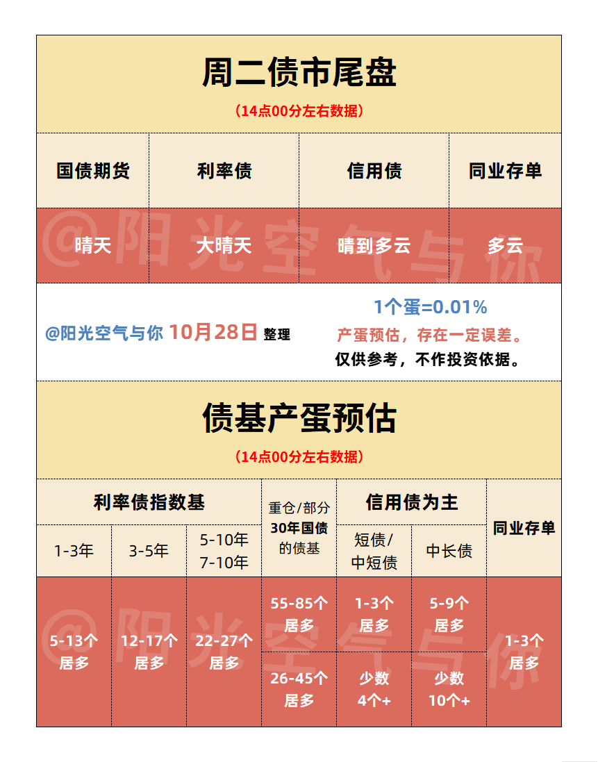 尾盘产蛋预估:重仓30年国债的基金有望爆蛋55-85个,其他纯债也有一部分恐龙蛋,混债基金预计涨跌各半(上证指数下跌0.15%,中证转债下跌0.31%)。17点30分左右还有一次债基收盘预估。