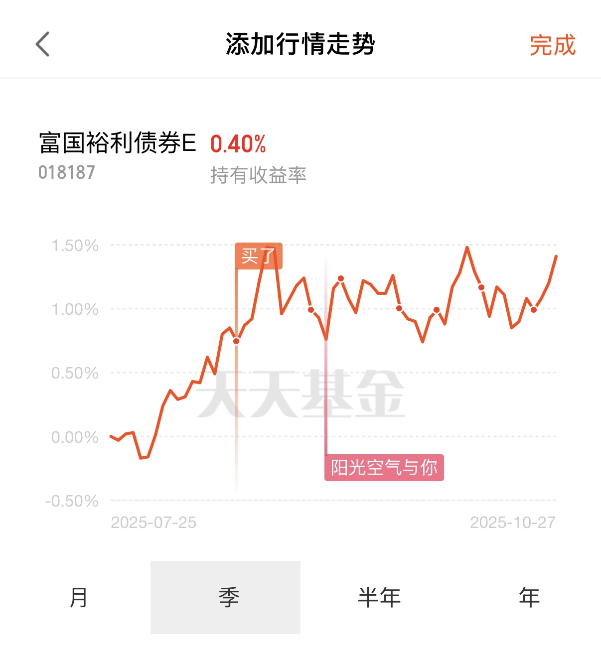 (2)今天阳光个人继续加仓富国裕利债券E,近1年涨幅7.09%,连续3天产蛋,而且已经连续7个季度正收益了,回撤控制也很出色,近1年最大回撤仅1.88%,是一只长期稳健增长的固收+基金。三季度报告更新了,富国裕利适度提升了利率债仓位,小幅降低了可转债仓位,股票仓位重点布局非银金融、有色金属,以及医药生物等行业,依然配置了一部分港股仓位,维持多行业、跨市场的均衡分散。再加上由金牛基金经理掌舵,投研实力更强,所以整体风格稳中有进,具有很好的上涨能力和抗跌性。趁着今天股市震荡,个人再加一些,作为长期稳健底仓放着。