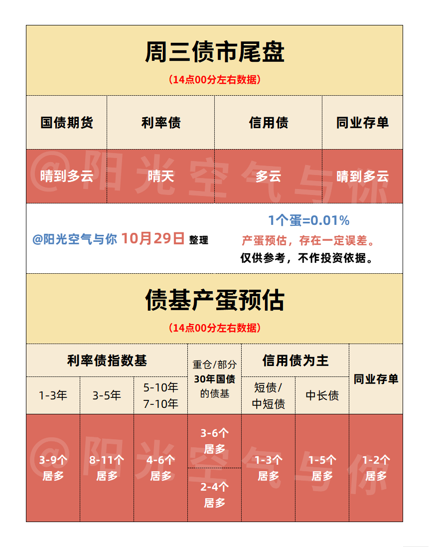 尾盘产蛋预估:纯债基金小产蛋为主,其中3-5年利率债基金表现更优,可能是买盘较强,混债基金预计产碎蛋各半(上证指数上涨0.55%,中证转债上涨0.82%,但个股上涨不到一半)。17点30分左右还有一次债基收盘预估。
