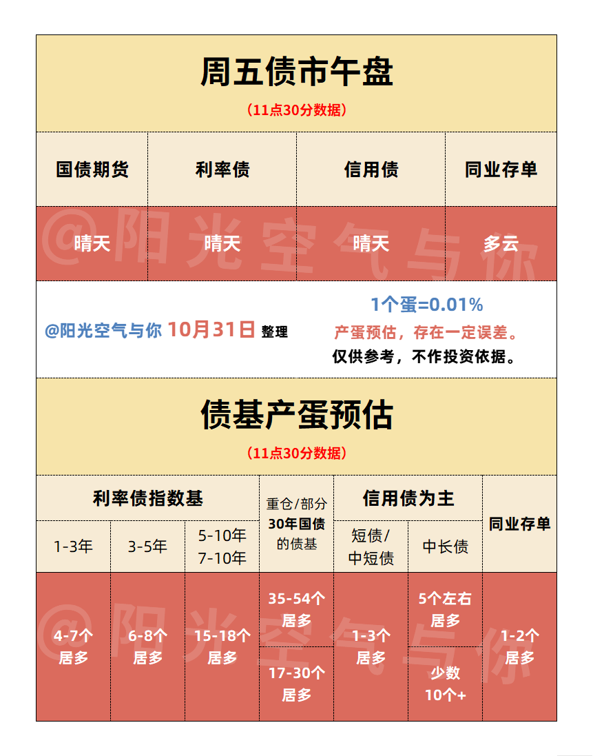 午盘产蛋预估:重仓30年国债的基金有望产蛋35-54个居多,7-10年利率债指数基金、以及少数信用债为主的中长债预计也有十几个。混债基金得看持仓了,预计是产碎蛋差不多各一半。