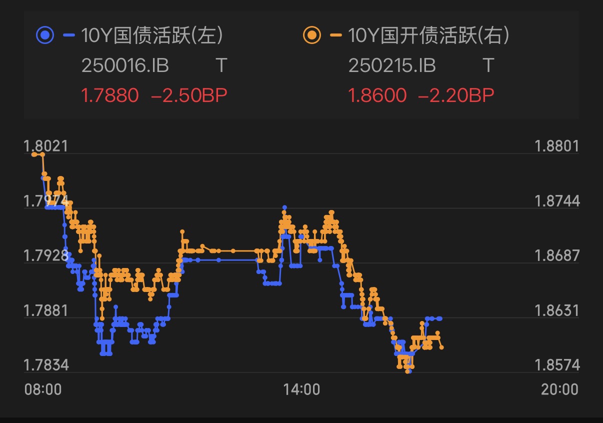 午后利率债继续拉升,10年期国债活跃券收益率大幅下行至1.7880。