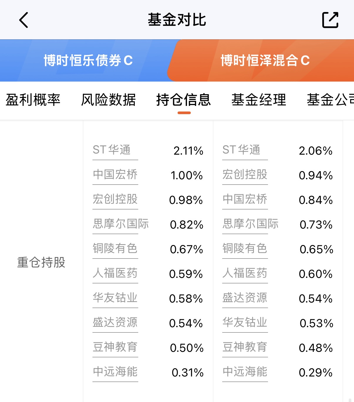 博时恒泽混合C则与博时恒乐债券C同属一位金牛基金经理管理,且采用相同策略,前十大重仓股一致,仅有细微差别,因此几乎是1:1的复制产品。